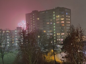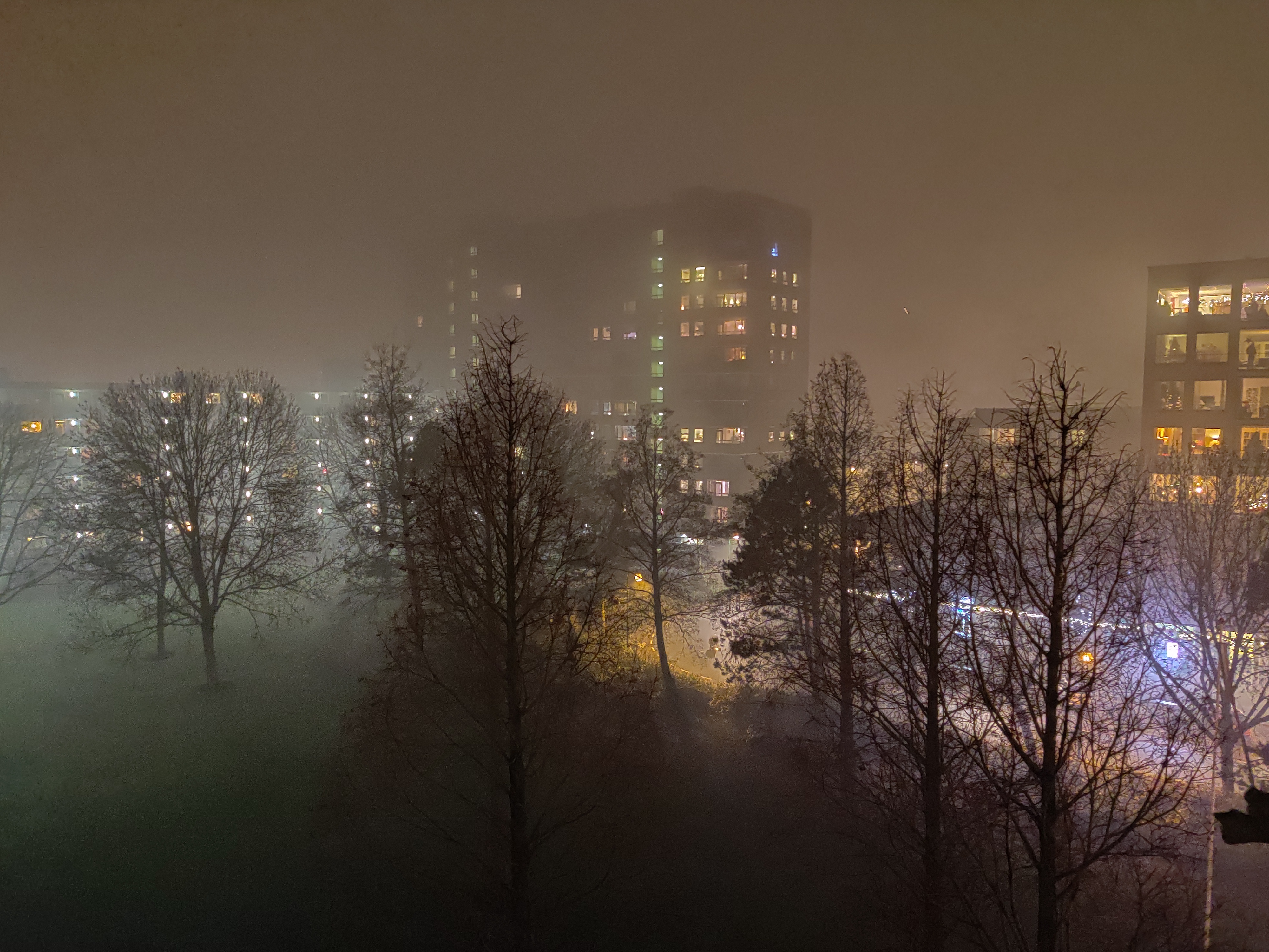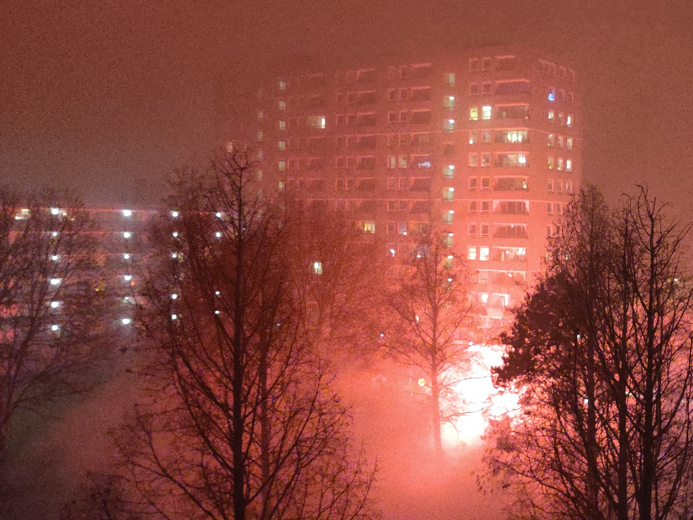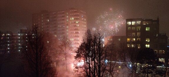 Jaarwisseling 2020 vanaf de Aert van Neslaan. Weer behoorlijk mistig, maar veel vuurwerk in de nabije omgeving.